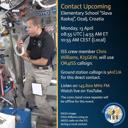 Radio klub Ozalj i osnovna škola Slava Raškaj u suradnji sa ARISS-om, svemirskim agencijama NASA , ESA, JAXA, ROSCOSMOS organizira razgovor sa astronautom na Međunarodnoj svemirskoj postaji, ISS. Razgovor je dogovoren za Ponedjeljak 13.04.2026. u 10:55 po lokalnom vremenu.  Na pitanja će odgovarati astronaut Chris WILLIAMS, KJ5GEW. Event se javljanjem će se odvijati u osnovnoj školi Slava Raškaj,Ozalj. Razgovor će se čuti iznad cijele Europe na frekvenciji 145.800Mhz.